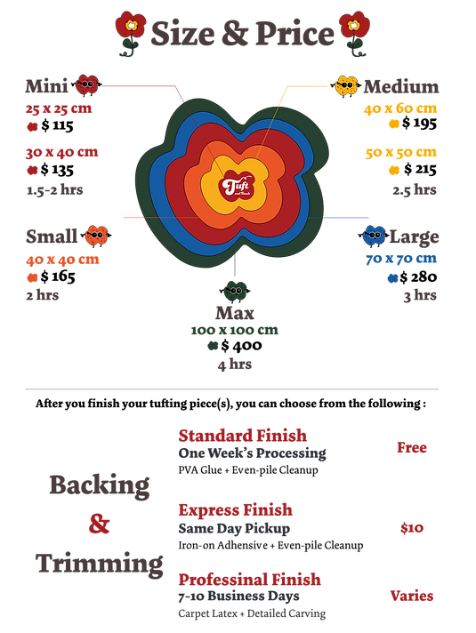 A: We recommend sending your design before you come, which we can help draw it on canvas and allow more time for Tufting part. But you are welcome to keep a few more options on your phone or choose you design upon arrival. Please refer to our Design Guide to find out more.